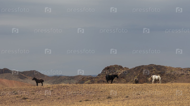 Небольшое стадо лошадей свободно бродит по пустынному казахскому ландшафту с холмами