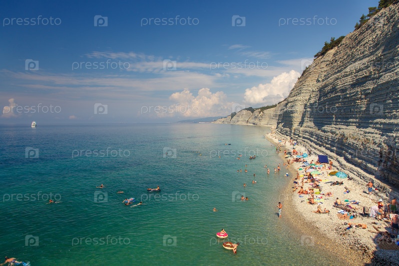 Пляж Сосновка, Геленджик.Люди загорают и купаются на пляже у подножия высоких белых скал.Чистая вода, солнечный свет