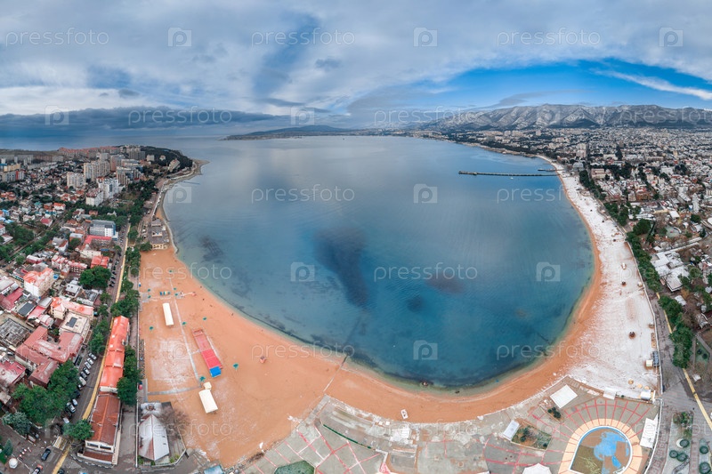 Зимняя панорама курорта Геленджик. Вид с воздуха. Снег на пляже залива Геленджик. Кавказские горы в снегу