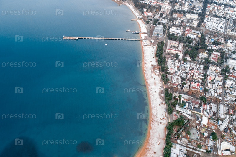 Центральный пляж Геленджика покрыт снегом. Вид с воздуха. Зима на курорте. В заливе Геленджик можно увидеть пристань морской станции