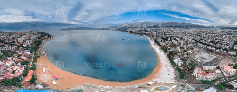 Зимняя панорама курорта Геленджик. Вид с воздуха. Снег на пляже залива Геленджик. Кавказские горы в снегу