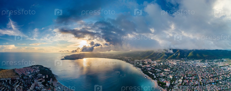 Панорама курорта в Геленджике. Солнце садится в районе 'тонкого' мыса. Солнце и облака отражаются на воде Геленджикской бухты. Кавказские горы справа