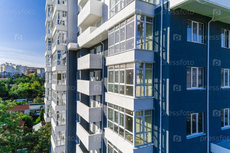 Новое, недавно построенное многоэтажное жилое здание. Вид с воздуха. Балконы, окна, новый дом