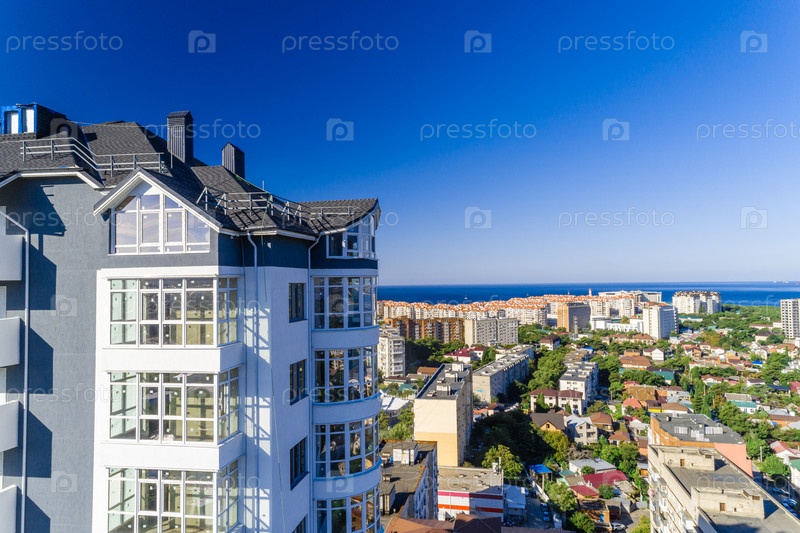 Новое многоэтажное здание на курорте Геленджик. Крыша, балконы и окна верхнего этажа. Вид на Черное море и геленджикский маяк