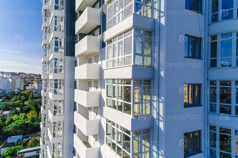 Новое, недавно построенное многоэтажное жилое здание. Вид с воздуха. Балконы, окна, новый дом