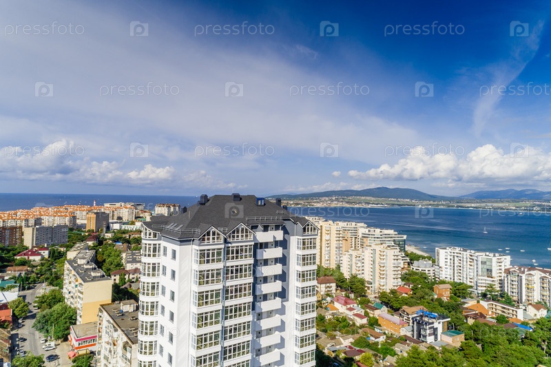 Новое многоэтажное жилое здание в курорте Геленджик. Вид с воздуха. Вид на Черное море, залив Геленджик и Кавказские горы