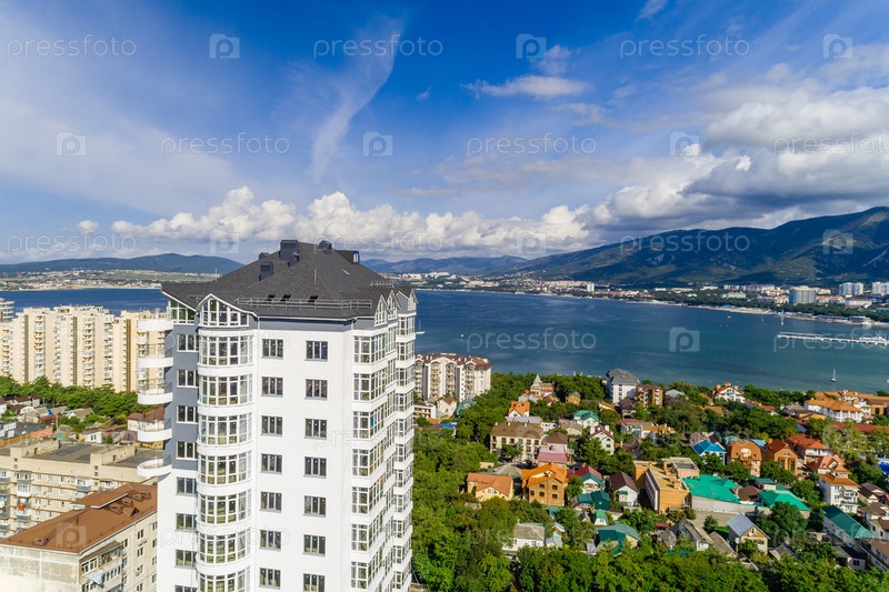 Новое многоэтажное жилое здание в курорте Геленджик. Вид с воздуха. Вид на Черное море, залив Геленджик и Кавказские горы