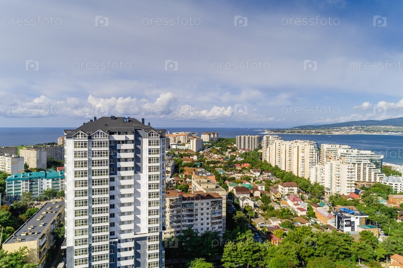 Новое многоэтажное жилое здание в курорте Геленджик. Вид с воздуха. Вид на Черное море, Геленджикский залив и Кавказские горы. На заднем плане виден маяк Геленджика