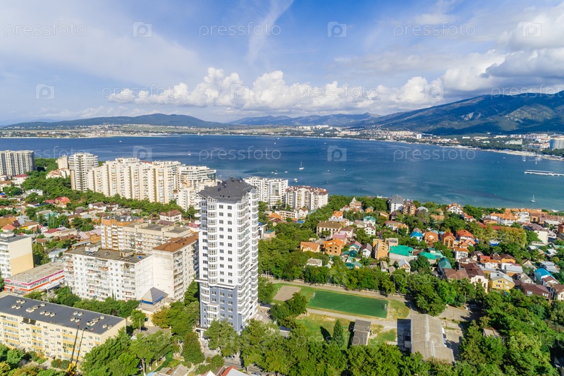 Панорама курорта Геленджик. Жилые здания на берегу моря. Геленджикская бухта с голубой водой. Кавказские горы на горизонте