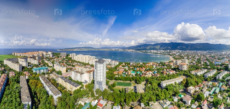 Панорама курорта Геленджик. Жилые здания на берегу моря. Геленджикская бухта с голубой водой. Кавказские горы на горизонте