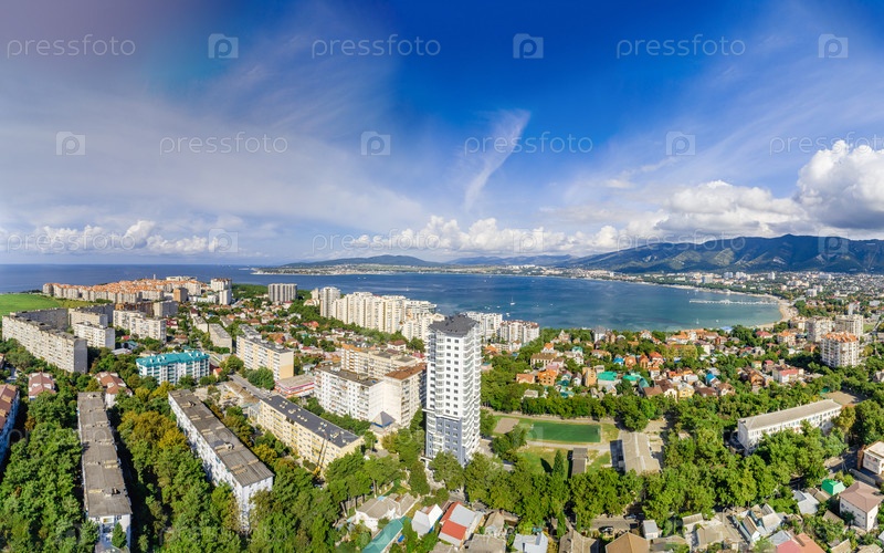 Вид с воздуха на Геленджик. Залив Геленджик с голубой водой. Пляж вдоль залива. Яхты на воде. Жилые здания вокруг залива. Кавказские горы в белых облаках