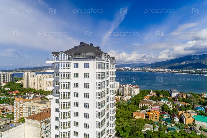 Новое многоэтажное жилое здание в курорте Геленджик. Вид с воздуха. Вид на Черное море, залив Геленджик и Кавказские горы