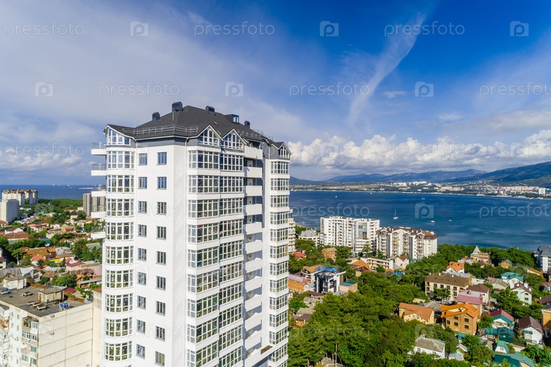 Новое многоэтажное жилое здание в курорте Геленджик. Вид с воздуха. Вид на Черное море, залив Геленджик и Кавказские горы