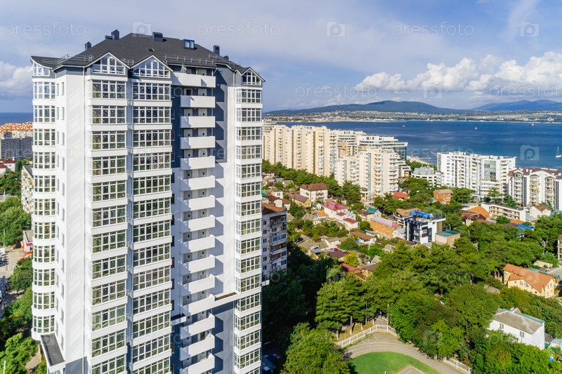 Новое многоэтажное жилое здание в курорте Геленджик. Вид с воздуха. Вид на Черное море, залив Геленджик и Кавказские горы
