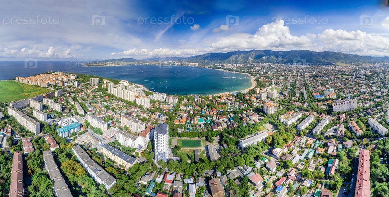 Вид с воздуха на Геленджик. Залив Геленджик с голубой водой. Пляж вдоль залива. Яхты на воде. Жилые здания вокруг залива. Кавказские горы в белых облаках