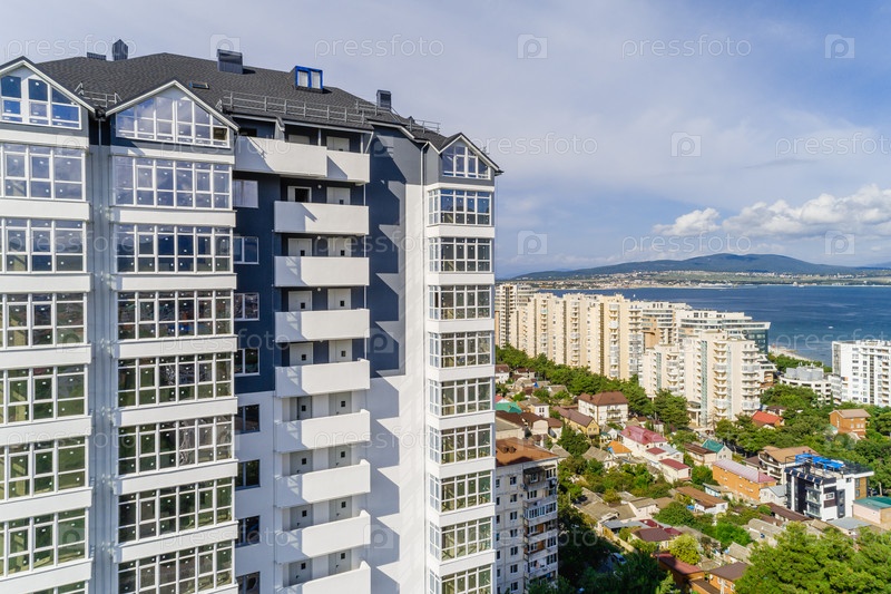 Новое многоэтажное жилое здание в курорте Геленджик. Вид с воздуха. Вид на Черное море, залив Геленджик и Кавказские горы