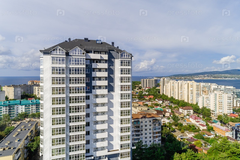 Новое многоэтажное жилое здание в курорте Геленджик. Вид с воздуха. Вид на Черное море, залив Геленджик и Кавказские горы
