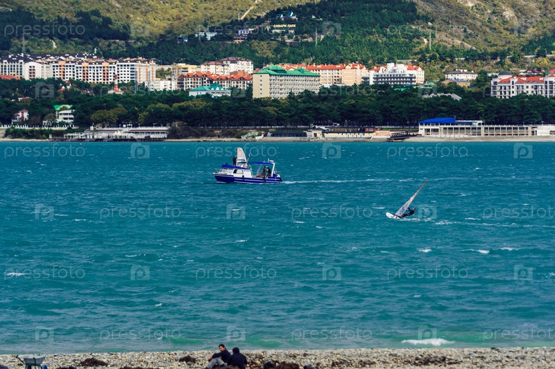 парусная регата в геленджике. виндсерферы соревнуются на голубой воде залива геленджик. дует ветер, дует солнце. город на заднем плане