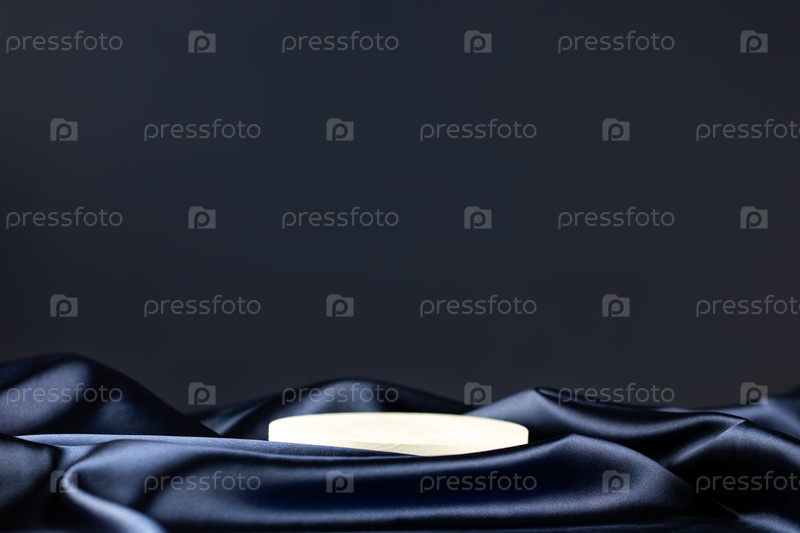 Белый подиум для установки продукции на ткань из голубого шелка на темном фоне
