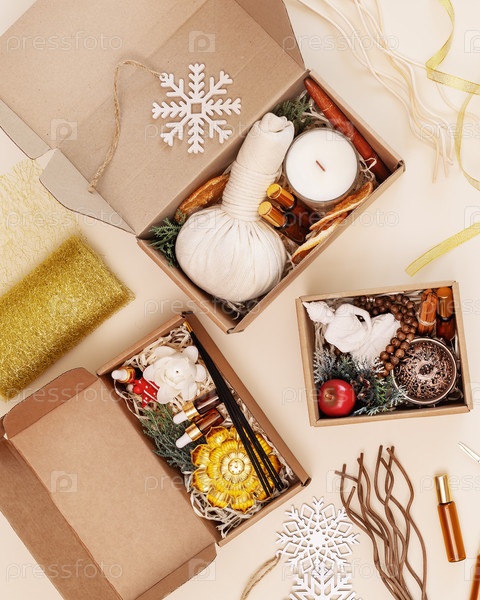 Изготовление рождественских наборов для медитации, расслабления и самообслуживания. Карточка отдыха с коробками подарков со свечами, ароматическими палочками, натуральными маслами и ювелирными изделиями. Мы готовим сюрпризы на Рождество и Новый год