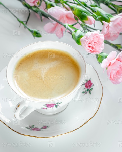 Элегантная чашка свежего кофе с розовыми гвоздиками