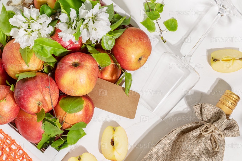 Фермерские яблоки в белой деревянной коробке, бутылка яблочного вина со стаканом на белом фоне. Экологическая композиция с летом, малоалкогольный фруктовый напиток. Фруктовое вино. Яблочный продукт. Стиль мягкой фокусировки