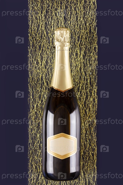 Бутылка шампанского на синем фоне с золотой ленточкой