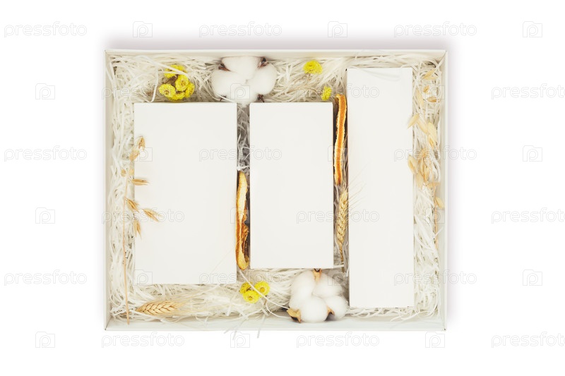 Подарочный ящик с тремя косметическими коробками с сухими цветами и фруктами