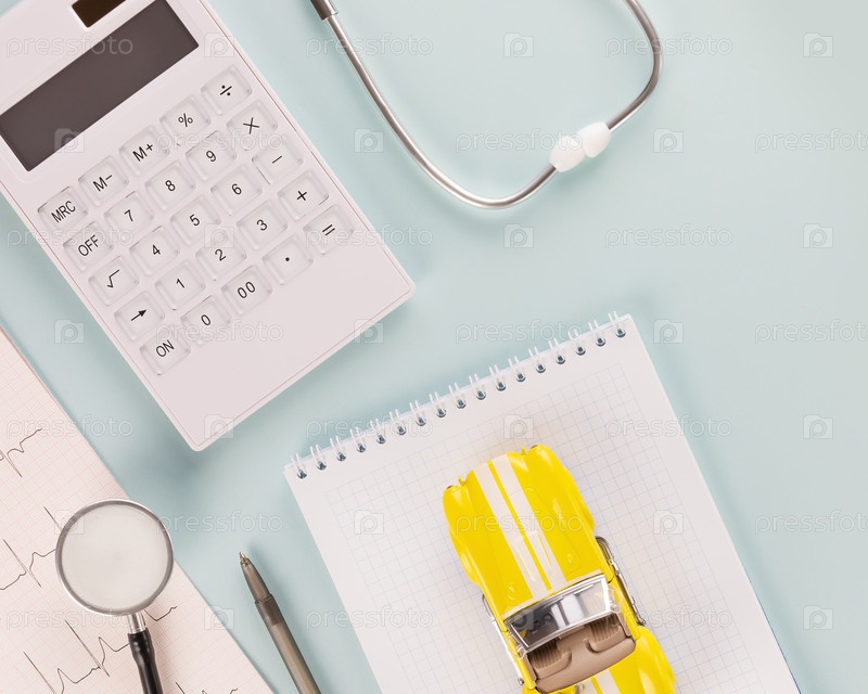 Калькулятор, стетоскоп, кардиограмма и игрушечная машина на ноутбуке