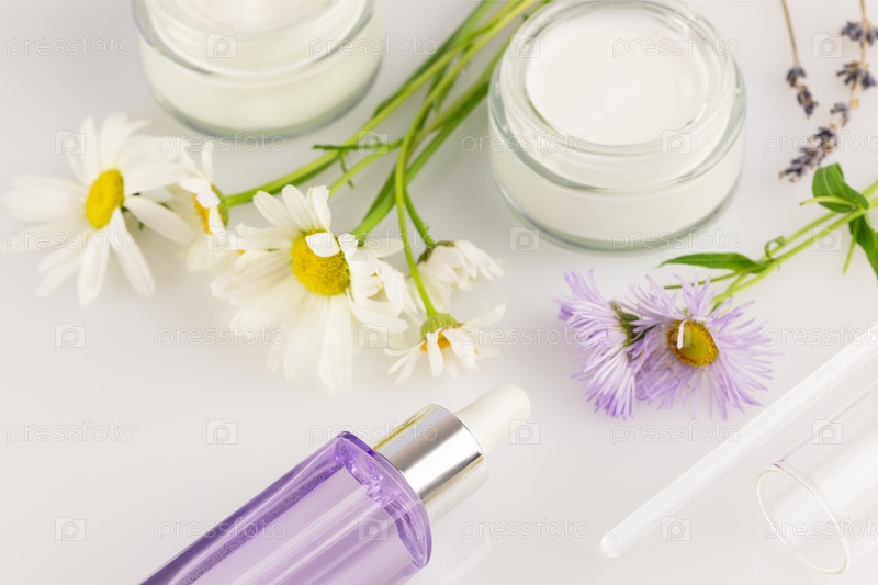 Этикетки с органическими кремами, сывороточной бутылкой и дикими цветами на белом фоне. Концепция дикой красоты и натуральная косметика на основе диких растений. Стиль мягкого фокуса