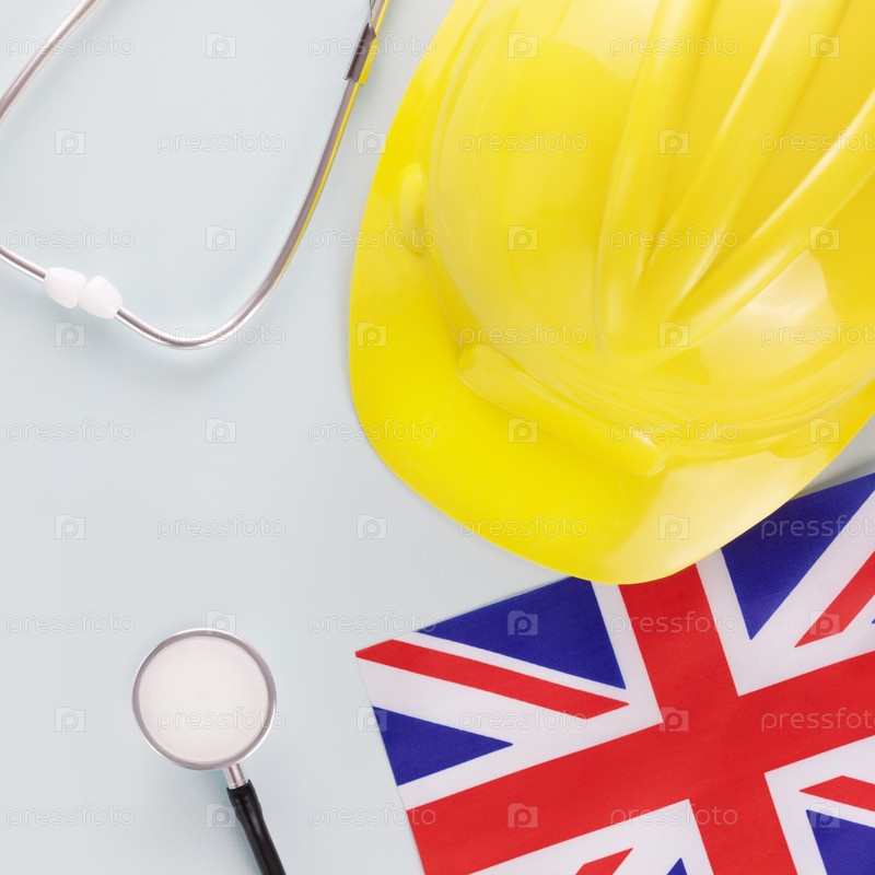 Здоровье и страхование работников в Великобритании Флаг Великобритании, стетоскоп и желтая шляпа на синем фоне Безопасность труда и право на работу в Великобритании