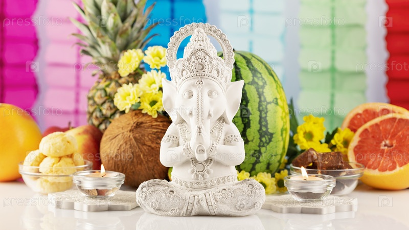 Скульптура Ганеши с фруктами, сладостями, цветами и драгоценностями