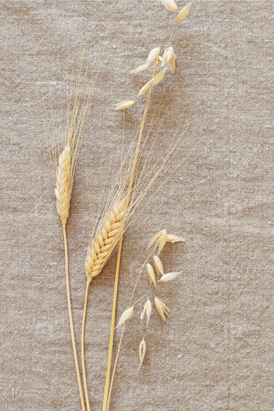 Ржаные и пшеничные колосья на естественном текстильном фоне