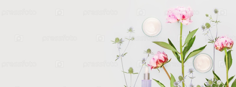 Косметический баннер со стеклянными косметическими банками с сливками, сывороткой и красивыми розовыми пионами на синем фоне с копировальным пространством. Естественные цветочные косметические продукты. Увлажняющие средства, косметические изделия
