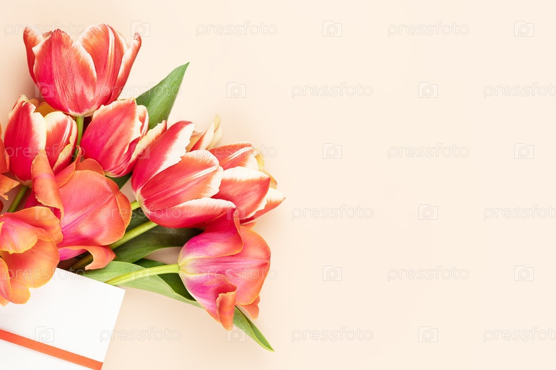 Цветочная открытка с красивым букетом тюльпанов в белом, подарочном бумажном пакете на розовом фоне с копировальным пространством. Праздник, цветочное оформление с красными тюльпанами подходит для 8 марта, женских и дней матерей