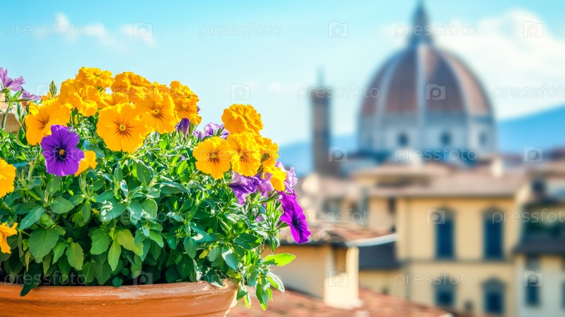 Цветочный горшок с красочными досками на террасе с видом на ландшафт Флоренции