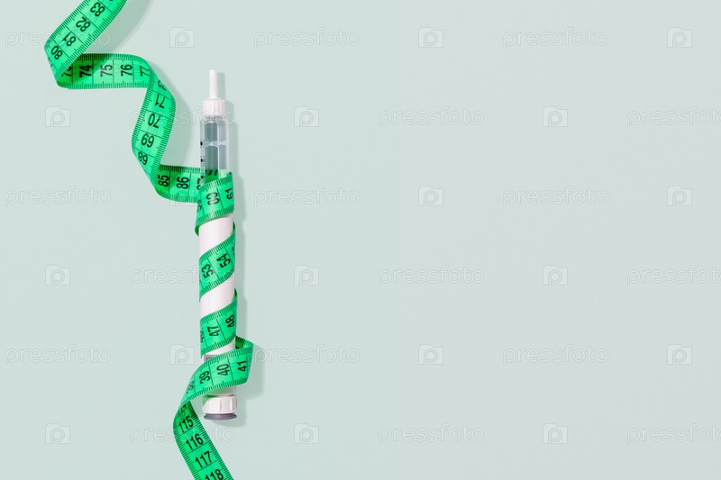 Ручка для инъекций для похудения, упакована в измерительную ленту на пастельном фоне с копией пространства. Медицинская концепция похудения, тенденции красоты, цели тела, эстетическое лечение и маркетинг здоровья
