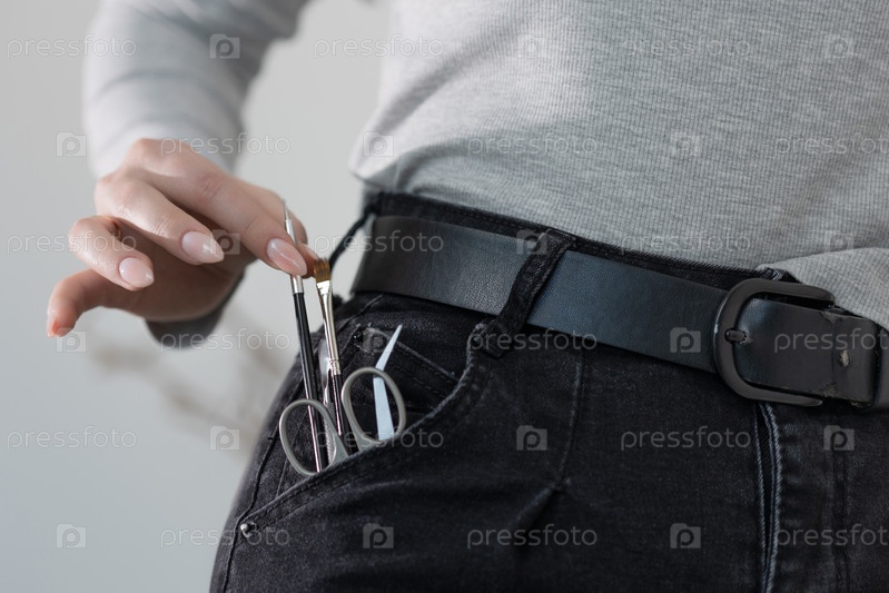 Креативные инструменты маникюра спрятаны в джинсовом кармане, демонстрируя игривость художницы на ногтях
