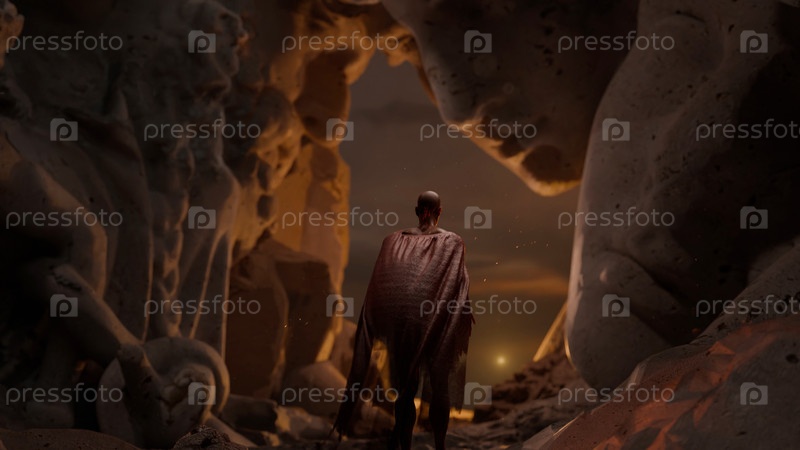 Путешественник в плаще проходит через пустынный каньон, окруженный гигантскими скульптурами древних богов