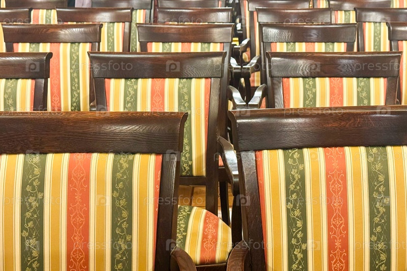 Полосатая обивка на древних деревянных стульях в теплых цветах и классических узорах.Концепция традиционного дизайна мебели, текстильные тенденции, интерьерный дизайн и выбор тканей, вдохновленных наследием