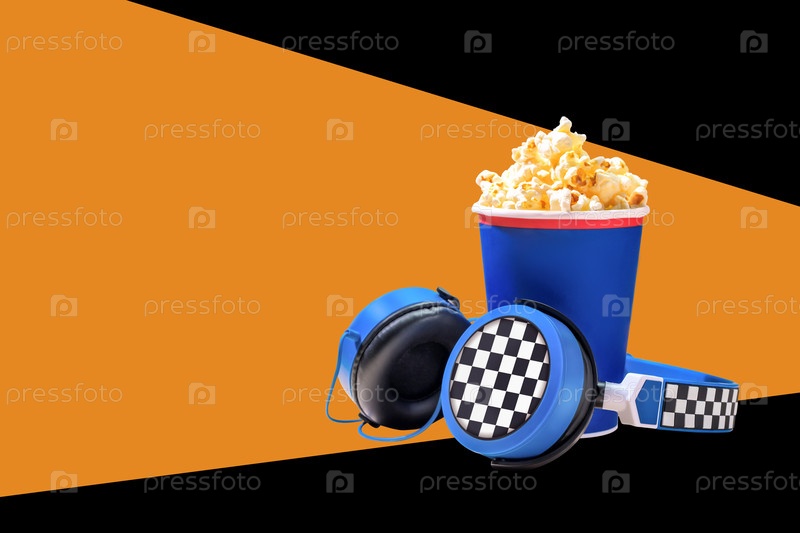 Popcorn Bucket and Checkered Headphones on Bold Graphic Background для концепций ночи кино, потокового развлечения, молодежной культуры, продвижения музыки и фильмов, а также модных визуальных эффектов для цифровых медиа