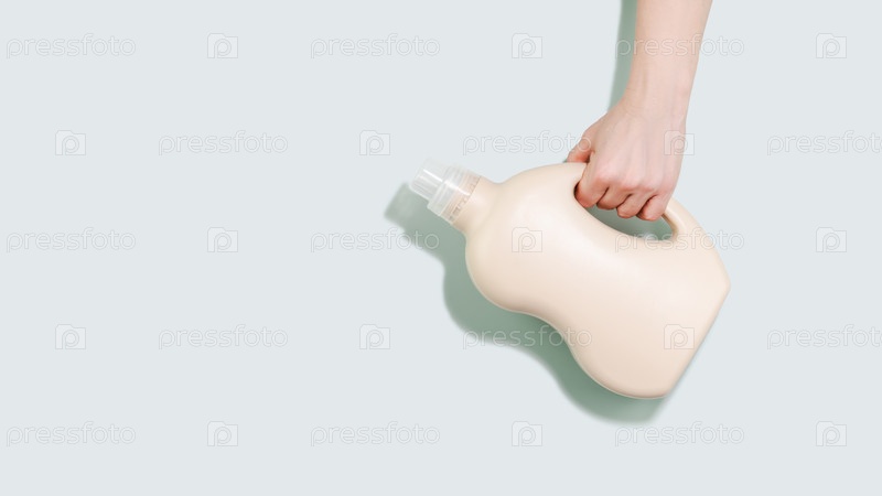 Ручное устройство, удерживающее минималистическую бутылку моющего средства на светло-синем фоне