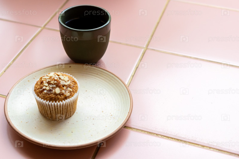 Чашка кофе и кекс на белой тарелке на розовом плиточном столе. кекс, посыпанный орехами