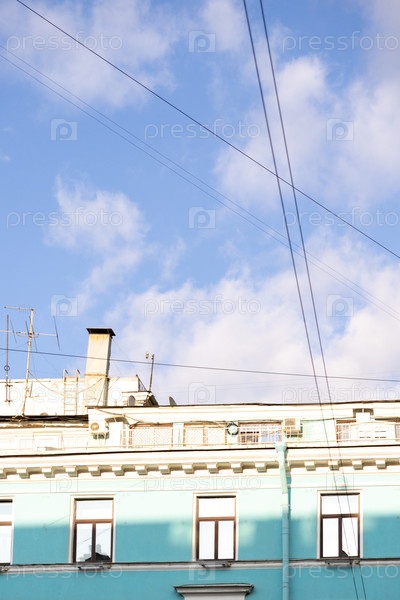Городская жизнь, дом с голубыми стенами после реставрации. Синее небо с несколькими облаками