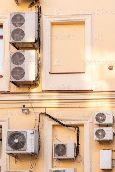 Кондиционеры установлены на стене здания. охлаждение в жаркую погоду