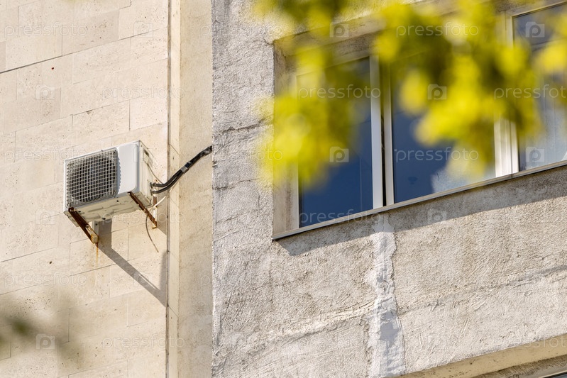 Кондиционер на стене многоквартирного дома с видом на зеленые деревья