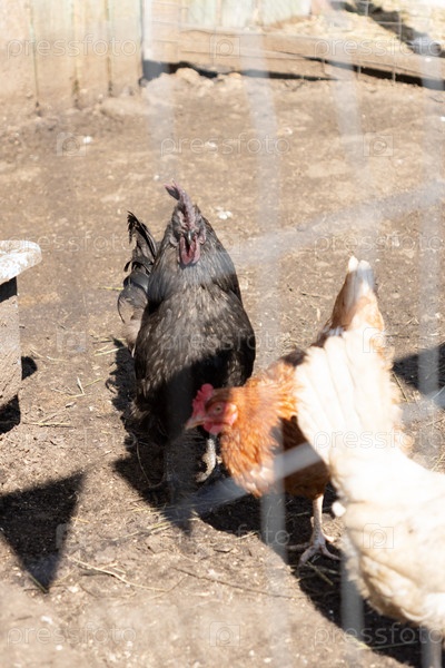 Группа цыплят, жующих землю и траву в клетке. падок огражден проволокой