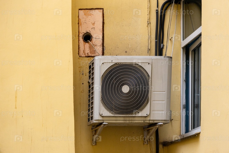 Грязный кондиционер установлен на желтой стене. вентиляция и охлаждение дома