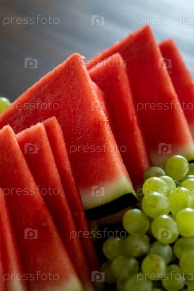 Тарелка с арбузом и виноградом стоит на деревянном столе