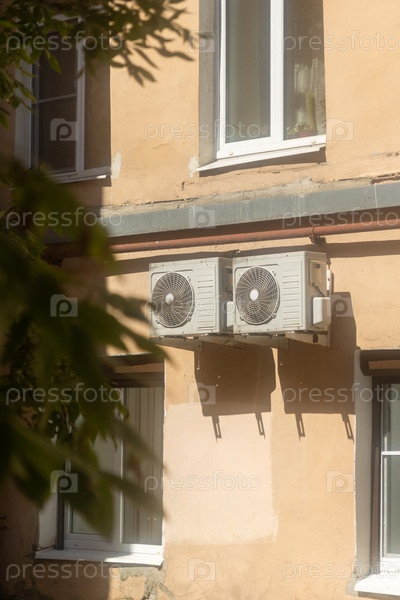 Кондиционеры установлены на фасаде здания.Устройство для комфортного проживания в жаркую погоду